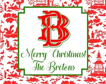 Preppy Pagoda Christmas Holiday Sticker, Gift Enclosure Card, Address Label - RED PAGODA CHINOISERIE - Set of 24