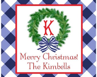Preppy Christmas Navy Blue Gingham Wreath Sticker, Gift Enclosure, Tag, Address Label - Set of 24