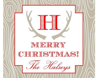 Christmas Holiday Sticker, Gift Enclosure Card, Address Label - WOOD GRAIN ANTLER - Set of 24
