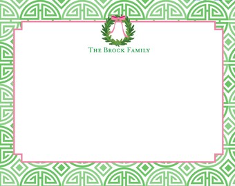 Double Happiness Pattern with Wreath Stationery, Notecards - Green Chinoiserie - Christmas Holiday