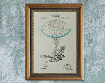 Flying Machine. Vintage Print. Paper Embroidery. Home Decoration. Thread Art. Stitch Art. Blue and Silver Wall Art. Science Art. Fiber Art