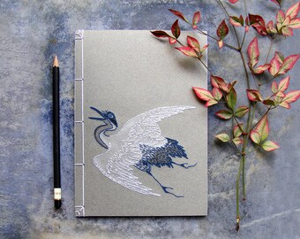 Japanese Crane Journal. Embroidered Notebook. Crane Bird Notebook. Stitched Journal. Japanese Journal. Ukiyo-e Journal. Stab Bound Notebook
