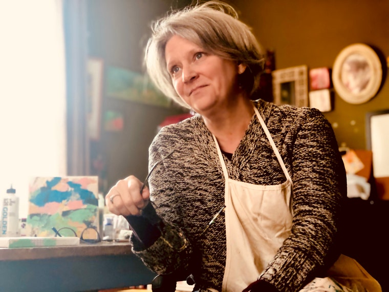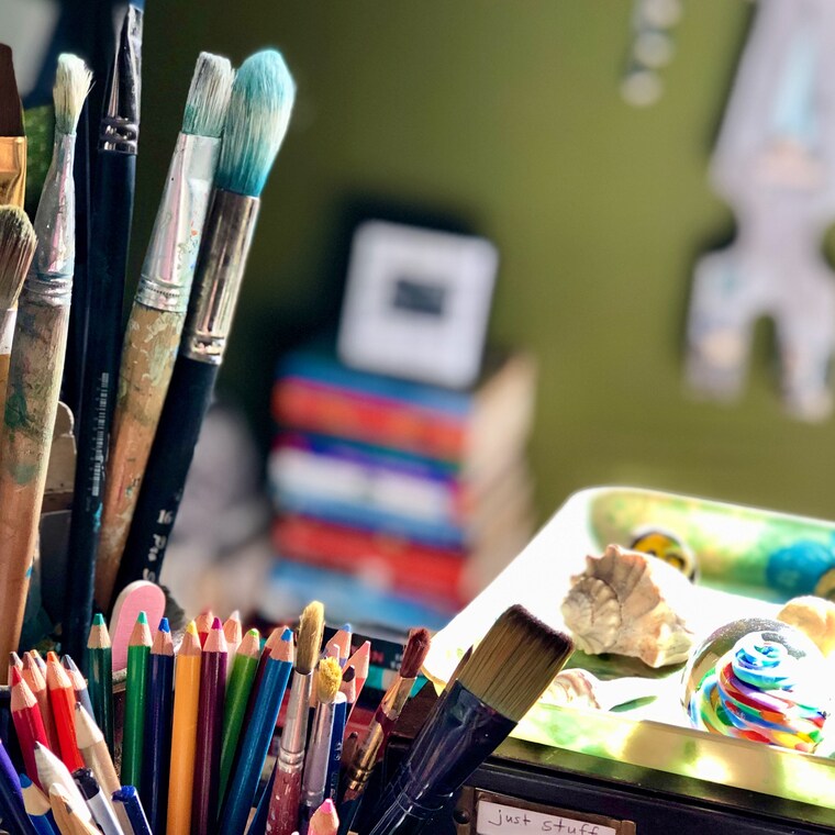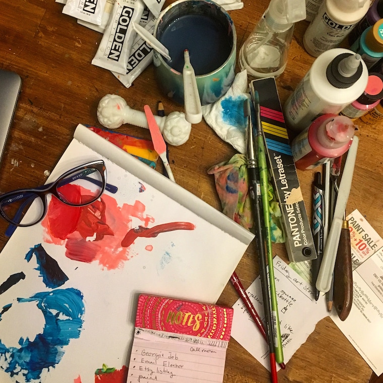 My own studio was converted from our dining room. (I'm lucky that our table fits in the living room quite nicely!) That's where you'll find me most days at the computer or at my painting table. I love listening to a podcast or music while I work. Always learning anything I can. My kids inspire me too. They are the most creative people I've ever known!