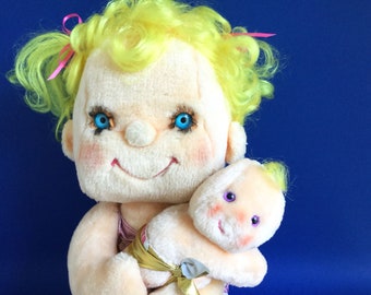 Vintage Precious Hugs Hugga Bunch Plush Doll with Baby Fluffer, 1985 Kenner Hallmark Cards, 17 inch doll, HuggaBunch, 80s Toy