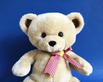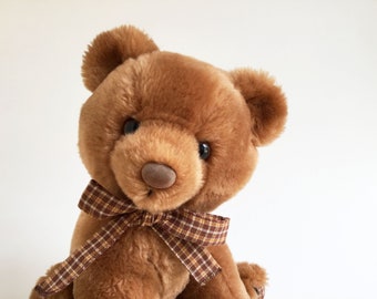 Vintage Teddy Bear, Dakin, 1984, Plaid Ribbon, stuffed animal, 1980s Toys, Plush Toy, 10"