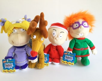 Christmas Rugrats Dolls, Set of 4, Angela, Spike the Dog, Tommy Pickles, Chuckie, Mattel, Viacom, 1997, Vintage Christmas