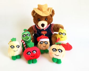 Set of Fruit Christmas Ornaments & Farmer Teddy Bear, Del Monte, Yumkins, 1991, Anthropomorphic