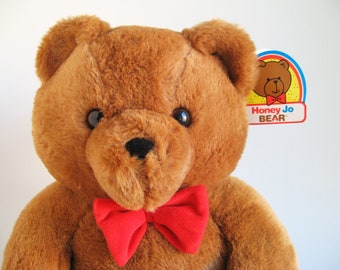 Vintage Honey Jo Dakin Teddy Bear, Mint with original Paper Tag, stuffed animal Fun Farm 80s Toys Red Bow Tie Plush 1986