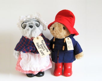 Vintage Paddington Bear & Aunt Lucy Plush Toy Teddy Bears Stuffed Animals 1980s Toy red, black wellies boots Wellingtons Rainboots