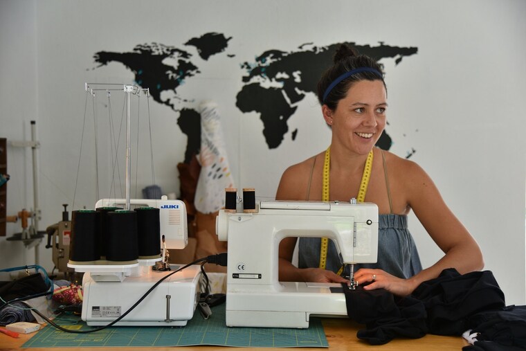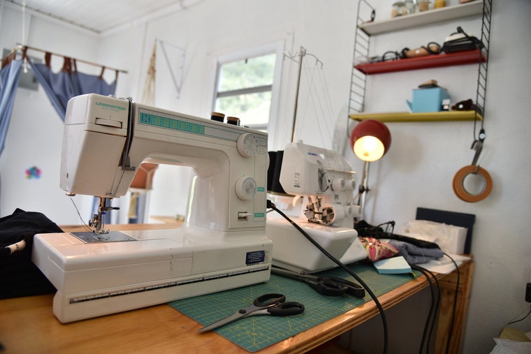 my sewing machine and overlock serger taking over my work table in my open atelier.