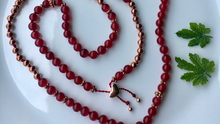 My own Courageous Heart Mala, made with glass and copper beads, and found a cute heart stopper focal bead. -