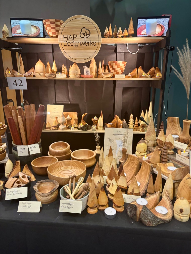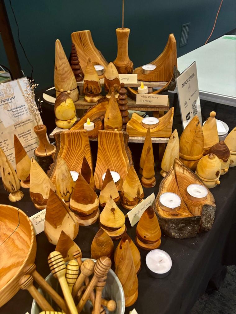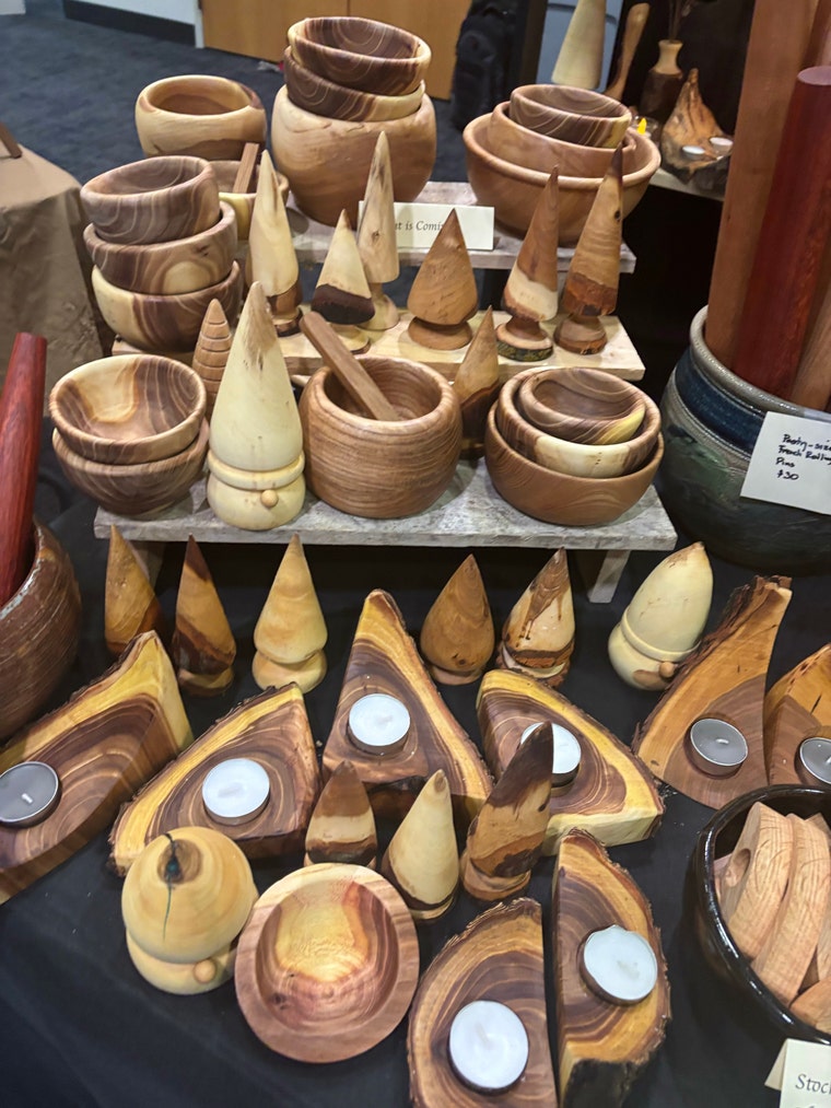 Bowls, Christmas trees, Forest Gnomes, French Rolling Pins. -