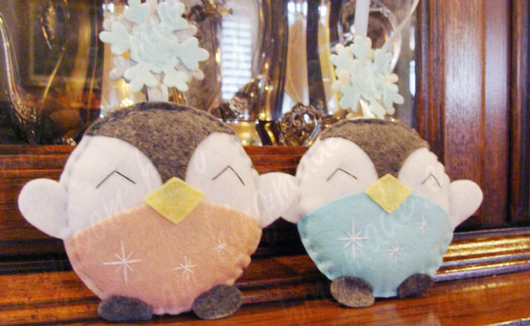Smiling penguin Christmas ornaments in front of the porcelain cabinet -
