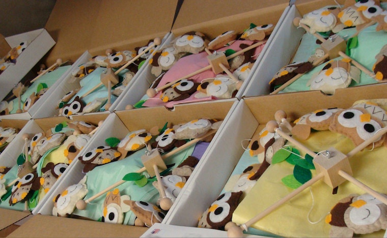 20 hand-made owl mobiles ready for delivery to a local preschool -
