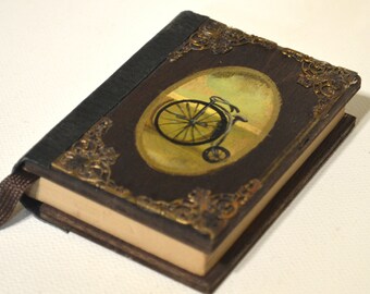 Mini handcrafted notebook, handmade handpainted small wooden journal, reclaimed wood, vintage victorian bicycle gift sketchbook