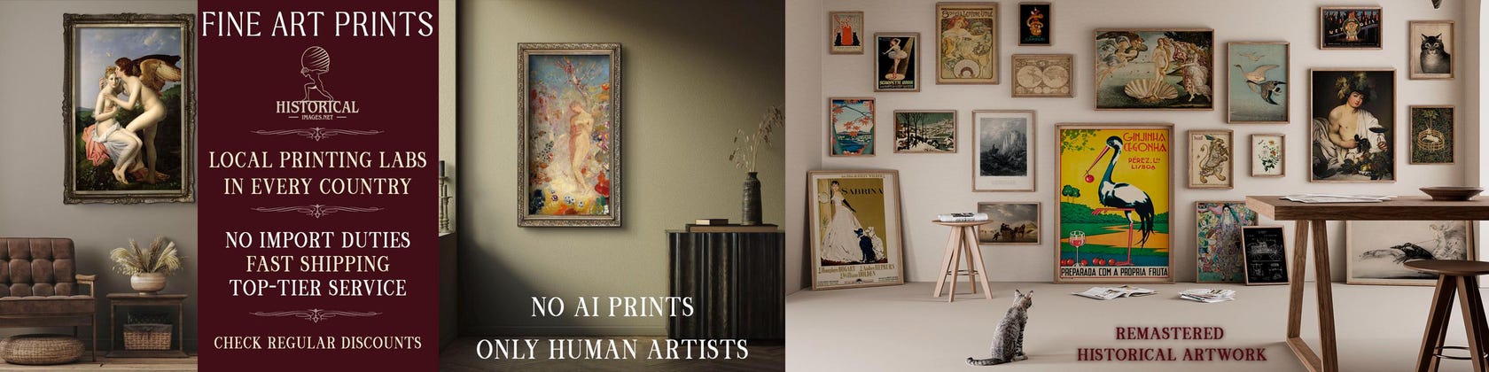 None of our artworks for sale at Historicalimages are generated with AI. We see many shops that have the name of a known artist under an AI image. We don't do that. The artworks here are of real persons and we do not create AI images "inspired" by known artists.