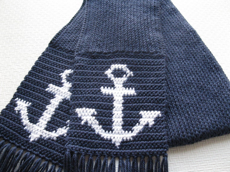 A finished scarf combining Don's knitting and my crochet anchors. -
