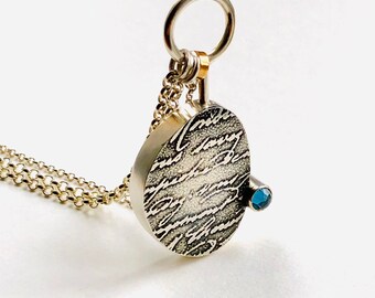 Silver and topaz etched calligraphy necklace with 18ct rose gold accent