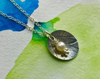 Silver hawthorn and pearl mini disc necklace