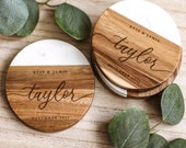 Complete your wedding tablescape with personalized coasters that add a delightful touch to every toast and conversation.