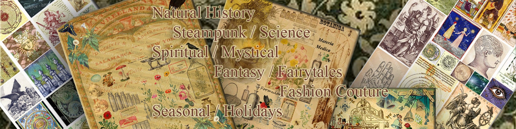 ImageSource Digital Scrapbook Papers and Collage Sheets, all of our images are copyright expired, and legal for artists to download and print to use in their scrapbooking, collage, decoupage, and other mixed media art projects. All images in the shop are available for instant download immediately following purchase.
