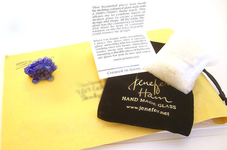 Here is how I foam-bubble-wrap my glass, including a how-I-make-it card and a velvet pouch. Shipped in a bubble env.