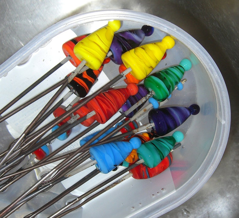 Player markers & jewelry, fresh from the kiln. Soaking in water and ready to be removed from the mandrel and cleaned. -