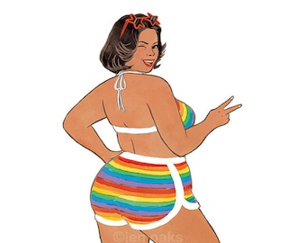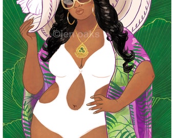 Curvy Pinup - 8x10 art print / fat, bbw, body positive / tropical poolside shades swimsuit sun hat muumuu kimono / bronze tan brown skin