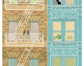 Fire Escapes - 9x12 print - urban brownstone victorian black cat