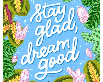 Stay glad, dream good - lettering art - 9x12 print - crystals, maranta, prayer plant, stars - motivational inspirational quote saying