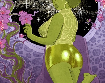 Curvy Pinup - 8x10 art print / fat, bbw, body positive, sexy sci-fi green afro, booty shorts in space