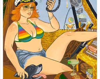 Captain's Quarters Curvy Pinup - 8x10 art print / fat, bbw, body positive / retro 70s custom van shag interior / vanlife vanning with dog