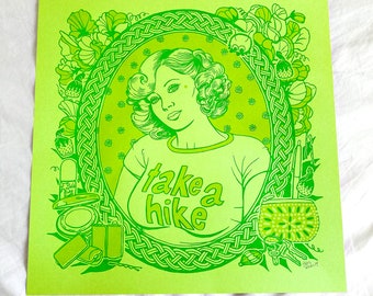 Sweet Pea Art Print 12.5x12.5 / Take a Hike / Hand Screenprinted Silkscreen green yellow / Feminist Art Gift