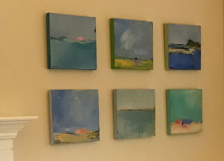 An art collector shared a photo of her gallery wall featuring 6 of my 12x12 paintings. -