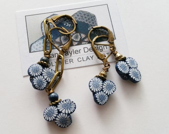 Earrings - Indigo Kiku - flower cluster - polymer clay