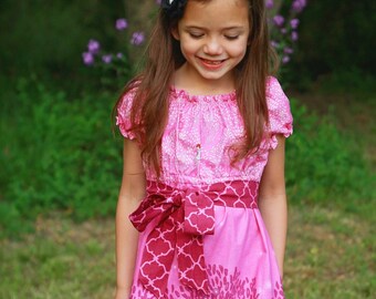 Colorful Super Kids Dress with Sash and m2m (matching) Hair Bow....Hot Pink, Aqua Polka Dots, Sizes 6, 12, 18 months, 2T, 3T, 4T, 5, 6, 7, 8