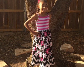 Custom Boutique Maxi Tank Dress, with Pink and White Striped Knit Bodice and, Black Chevron Ruffle and Twirly Skirt with Hot Pink Flowers