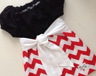 Sweet and Elegant Black and White Chevron Christmas Peasant Dress with Vibrant Red Sash