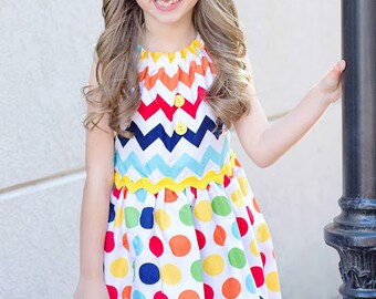 The Morgan Dress- With Flutter Sleeves in Rainbow Chevron and Polka Dots...Custom, Boutique, sizes 12, 18 months, 2T, 3T, 4, 5, 6, 7