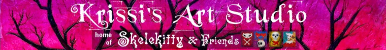 Krissi Sandvik is the artist/owner of Krissi's Art Studio, home of Skelekitty & Friends in California Gold Country, where she resides with her husband, cats, tortoise, and two dogs, Abby the Jack Russell and Bodie the McNab Border Collie/Heeler mix.