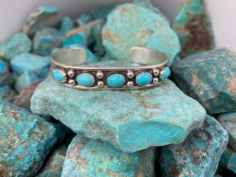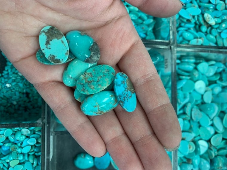 We buy raw stones directly from the Turquoise mines! Here's some ruff stones with a finished bracelet. -
