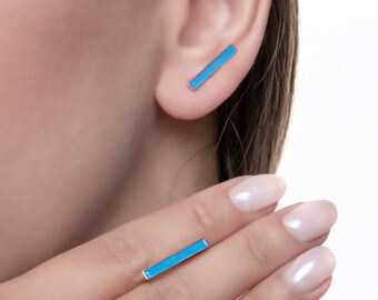 Blue enamel ear pins, White GOLD 18K earrings, rectangle ear jackets, one of a kind handmade earrings, modern jewelry gift for girlfriend