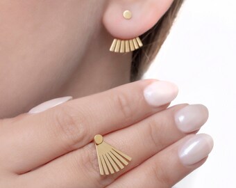 Fan shaped GOLD Ear jackets, double earring, round stud golden, contemporary earring, statement jewelry trendy, front back posts two piece