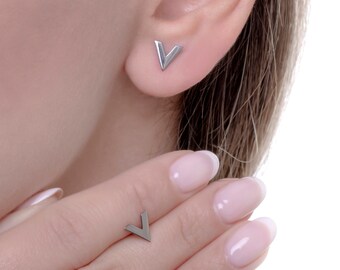 V earrings gray Gold, tiny chevron stud earring, letter jewelry triangle, solid gold posts, chevron jewelry minimalist, gift for girlfriend
