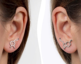 Dopamine earrings Serotonin, Silver jewelry molecule, mix match earrings comfortable, ear cuff science gift nurse, doctor jewelry graduation
