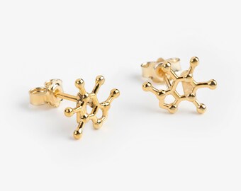 YELLOW GOLD Caffeine earrings, solid gold studs molecule, scientist gift for her, jewelry coffee lover, chemistry jewelry molecule posts