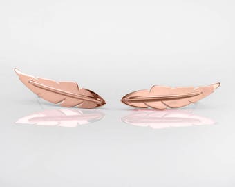 ROSE GOLD Feather jewelry, ear climbers women, comfortable earrings elegant, golden feather ear cuff, fine jewelry minimal, romantic earring