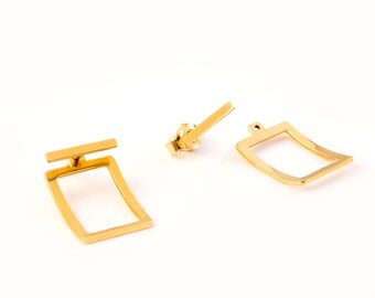 Yellow GOLD Square ear jackets, bar stud double earring, statement jewelry trending, geometric earring modern, front back ear lobe two piece