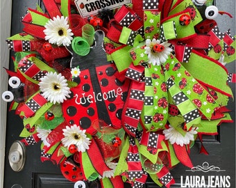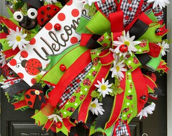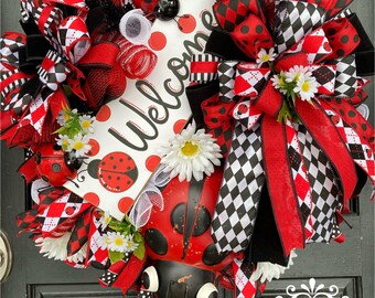Welcome wreath, Lady bug wreath, summer wreath, spring wreath, front door wreath, red white and black wreath