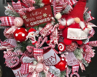 Christmas Gnome wreath, Red and white Christmas wreath , Holiday Door decor